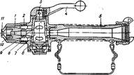 Из комбинированного ствола РСК-50 (рис. 1.22) подают как компактные, так и распыленные струи. Стволы этого типа входят в комплект только пожарных автомобилей. При положении ручки 4 пробкового крана 3 вдоль оси корпуса 5 поток жидкости проходит через центральное отверстие центробежного распылителя 1 и далее выходит из насадки 11 в виде компактной струи. При повороте ручки крана на 90° центральное отверстие перекрывается и поток жидкости из полости 7 пустотелой пробки крана через отверстия 6 и 9 поступает в каналы 2 и 3. Через тангенциальные каналы 10 жидкость попадает в центробежный распылитель и выходит из него закрученным потоком, который под действием центробежных сил при выходе из насадка распыляется, образуя факел с углом раскрытия 60°. Рис. 1.22. Комбинированный ручной пожарный ствол РСК-50 1, 2, 8—каналы; 3 —пробковый кран; 4 —ручка; 5 — корпус; б, 9 — отверстия; 7 — полость; 10 — тангенциальные каналы; 11— насадок