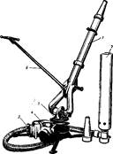 К рукавному оборудованию относятся: всасывающая сетка, соединительные головки, разветвления, водосборник, ручные и лафетные стволы. Рукавное оборудование отливают из алюминиевых сплавов АЛ-9В или АК-6 с последующей механической обработкой. Всасывающая сетка (рис. 1.20) присоединяется на конце всасывающей рукавной линии перед началом работы насоса из открытого водоема. Она предназначена для защиты всасывающей линии от попадания посторонних предметов, а также для удержания столба жидкости в линии при кратковременном прекращении подачи или при заливке насоса водой перед пуском. При работе насоса из открытого водоисточника во всасывающей линии создается разрежение. Вода под действием атмосферного давления, поднимая клапан 1, поступает во всасывающую линию и далее в полость насоса. При остановке насоса клапан опускается в гнездо и всасывающая линия остается заполненной водой. Чтобы освободить линию от воды, необходимо при помощи веревки, прикрепленной к кольцу 3, повернуть рычаг 2, клапан приподнимется и вода вытечет из рукавов.