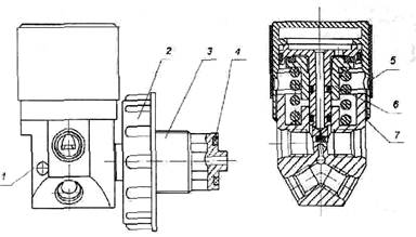 Рис.4.11. Редуктор: 1 – корпус редуктора; 2- маховичок; 3 – резьбовой штуцер; 4 – кольцо 9В8.684.909; 5 – манжета; 6 – предохранительный клапан; 7 – пломба.