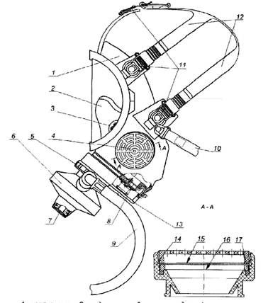 Рис.4.12. Маска ПМ – 2000 с легочным автоматом (вариант 1) 1 - корпус маски; 2 - подмасочник; 3 - клапаны вдоха; 4 - переговорное устройство; 5 – гайка; б - позорный автомат; 7 - многофункциональная кнопка; 8 - клапан выдоха; 9 - шланг легочного автомата; 10 – лямка; 11 – замок; 12 - ремни оголовья; 13 - крышка клапанной коробки; 14 – корпус; 15-сетка; 76 - мембрана; 17- кольцо.