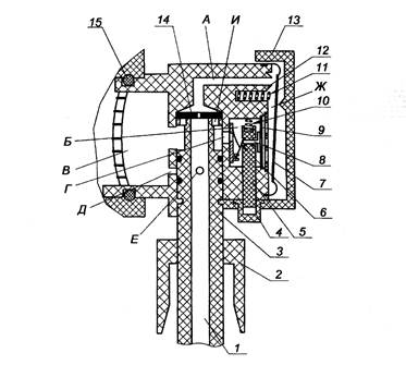 1 - шланг легочного автомата; 2 - маховичок байпаса; 3 - шток; 4 - кнопка отключения легочного автомата; 5 - шток; 6 - плоская пружина; 7 -мембрана; 8 - седло; 9 - мембрана; 10 - пружина; 11 - пружина; 12 - седло; 13 - крышка; 14 - клапан; 15 - кольцо 054.111.22. А - канал; Б, В, Ж- полости; Г, Д, Е, И - отверстия.
