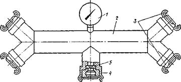 Рис. 5.30. Дозирующая вставка / — манометр; 2 — корпус; 3 — соединительные головки; 4 — приемный патрубок; 5 — дозирующая шайба.