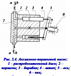 где d – диаметр поршня, м; S – ход поршня, м; n – частота перемещения поршня, с-1. Поршневые насосы обладают рядом достоинств. Они могут перекачивать различные жидкости, создавая большие напоры (до 15 МПа), обладают хорошей всасывающей способностью (до 7м) и высоким КПД Их недостатками являются: тихоходность, неравномерность подачи жидкости и невозможность ее регулировать. Поршневые насосы применяют для заполнения огнетушителей, газовых баллонов, их испытаний и т.д. Аксиально-поршневые насосы (рис. 2.4). Несколько поршневых насосов 2 размещены в одном барабане 3, вращающемся на оси распределительного диска 1. Штоки поршней 4 шарнирно закреплены на диске, вращающемся на оси 5. При вращении вала 6 поршни перемещаются в осевом направлении и одновременно вращаются с барабаном.