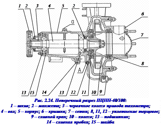 Пожарные насосы этого типа – насосы нового поколения. Основные конструктивные элементы и системы, обеспечивающие их функционирование, аналогичны элементам и системам насосов ПН. Однако в конструкции насосов ПЦН имеется ряд принципиальных особенностей, отличающих их от насосов ПН. В этих насосах герметизация внутренних полостей осуществляется уплотнениями торцового типа. Элементы этих уплотнений изготовлены из силицированного графита. Этот материал характеризуется высокой износостойкостью и, следовательно, обеспечивает долговечность уплотнений. Уплотнения рабочих колес пожарных насосов могут быть и комбинированными. Так, по желанию заказчика изготавливаются насосы, в которых уплотнения рабочих колес и межступенчатые уплотнения выполняются щелевыми, а концевые уплотнения вала – торцовыми. Существенным является также и то, что струйные насосы в вакуумных системах заменены пластинчатыми насосами с механическим приводом. Важным является то, что в конструкции насосов реализованы автоматические системы управления забором воды из естественных водоисточников. Ручной привод является дублирующим. Внесены изменения и в систему подачи пенообразователя. Так, предусматривается автоматическое выключение подачи пенообразователя при выключении пенных стволов или ГПС. На некоторых ПЦН предусмотрен автоматический контроль и поддержание концентрации пенообразователя в воде. На насосах предусмотрена установка счетчиков продолжительности их работы. Пожарный центробежный насос низкого давления – ПЦНН-40/100. Продольный разрез насоса представлен на рис. 2.24. Вал 4 насоса установлен в корпусе 5 на двух подшипниках 13. Левый подшипник в осевом направлении закреплен шайбой 15, привинченной к корпусу привода тахометра. Червячное колесо 3 этого привода в осевом направлении закреплено втулкой шкива 1. Шкив закреплен на валу гайкой. На металлической основе шкива завулканизирована резиновая оболочка. Этот шкив является приводом вакуумного насоса.