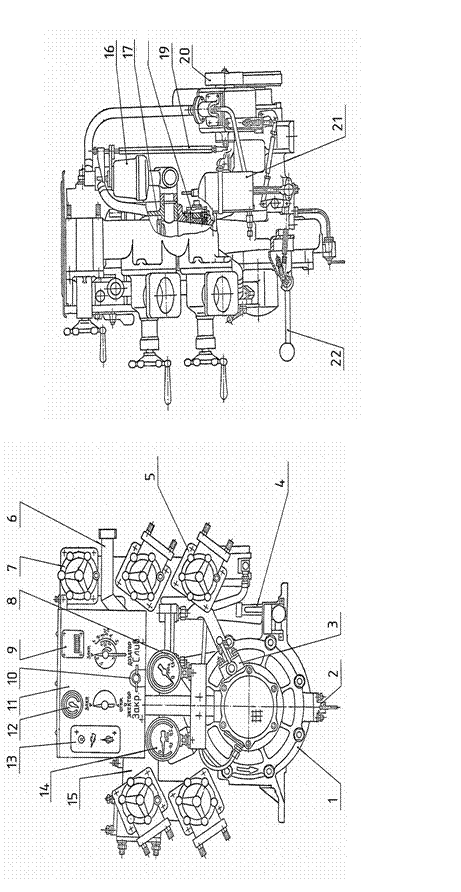 Непосредственно на насосе установлены сливной кран 2, вакуумный кран 3, масляный бак 21 и вакуумный насос 20. Внутри коллектора находятся падающий клапан 17 и датчик концентрации пенообразователя 18. К коллектору присоединен гидроблок 16 с тягой 19, управляющий включением и выключением вакуумного насоса 20.