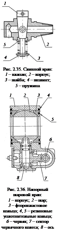Уровень масла в масляной ванне контролируется маслоуказателем 4. Напорные вентили 5 и вентиль 7 заполнения цистерны (рис. 2.25) идентичны. На винте 8 размещен клапан 3 (рис. 2.26). При вращении маховичка 12 винт 8 ввинчивается во втулку 10, открывая путь воде из коллектора в рукавную линию. Шаровые краны используются для слива воды из насоса и включения вакуумной системы. Устройство сливного крана показано на рис. 2.27. В корпусе 5 крана находится шарик 6 с двумя отверстиями. Он уплотняется резиновыми кольцами 7. В положении, указанном на рисунке, вода непрерывно по трубке 8 поступает из канала А зоны уплотнения центробежного насоса (см. рис. 2.24, поз. А и 9) и из корпуса насоса и выливается за борт автомобиля. При повороте рукоятки 1 на себя вода сливается только из полости А. Падающий клапан тарельчатого типа. Его устройство показано на рис. 2.28. Он предназначен для предотвращения обратного тока воды при остановке насоса, когда рукава поданы в верхние этажи, а также для герметизации полости насоса при работе вакуумной системы.