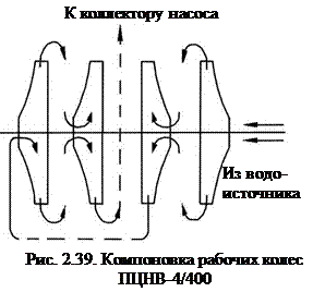 * При работе одной или двух ступеней. Примечания: 1. Потребляемая мощность и КПД ПЦНК указаны для случая подачи и напора нормального или высокого. При одновременной подаче воды секцией нормального и высокого напора ее величина равна соответственно 15 и 2 л/с (величины напоров номинальные). В этом случае общий КПД не менее 0,35, а потребляемая мощность не более 64,5 кВт. 2. Параметры характеристик в табл.2.2 получены при глубине всасывания 3,5 м и номинальных частотах вращения валов насосов. При максимальной глубине всасывания подача насосов уменьшается на 50 %.