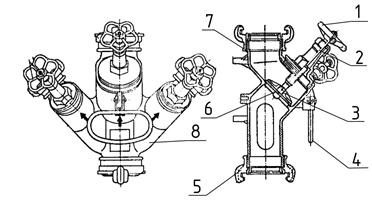Рукавный водосборник предназначен для соединения двух Рукавный водосборник состоит из корпуса-тройника, двух напорных соединительных цапковых головок ГЦ-80 для присоединения напорных или напорно-всасывающих рукавов и выходной соединительной головки для установки водосборника на всасывающем патрубке насоса. Внутри корпуса водосборника закреплен шарнирно-тарельчатый клапан для перекрывания одного входного патрубка при работе насоса от гидранта на один рукав. Рукавное разветвление предназначено для разделения потока и регулирования количества подаваемого огнетушащего вещества, транспортируемого по напорным пожарным рукавам. В зависимости от числа выходных штуцеров и условного диаметра входного штуцера различают следующие типы разветвлений: трехходовые РТ-70 и РТ-80 и четырехходовые РЧ-150. Наибольшее распространение имеют трехходовые разветвления. Они имеют три выходных и один входной штуцер. Четырехходовые разветвления применяют на передвижных насосных станциях и рукавных автомобилях. Разветвления всех типоразмеров имеют в основном одинаковую конструкцию (рис. 3.11) и состоят из фигурного корпуса 8, входного 5 и выходного 7 патрубков. На всех патрубках разветвлений навернуты муфтовые соединительные головки. Входные патрубки снабжены запорными механизмами вентильного типа с тарельчатым клапаном 6, маховичком 1, шпинделем 3 и сальниковым уплотнением 2. Для переноса разветвления имеется ручка 4.