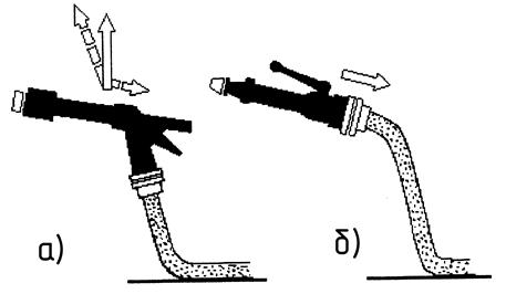 В результате совершенствования конструкции разработаны ручные пожарные стволы пистолетного типа, сила реакции струи для которых разделяется на несколько составляющих и направлена вверх (рис. 3.21, а). Это значительно упрощает работу ствольщиков при тушении пожаров. Стволы лафетные комбинированные (водопенные) предназначены для формирования сплошной или сплошной и распыленной с изменяемым углом факела струй воды, а также струй воздушно-механической пены низкой кратности. Лафетные стволы подразделяются на стационарные, монтируемые на пожарном автомобиле; возимые, монтируемые на прицепе, и переносные. Переносные лафетные стволы входят в комплект пожарных автоцистерн и насосно-рукавных автомобилей. Переносной лафетный ствол