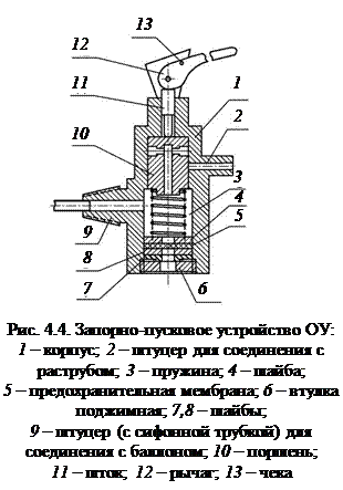 В ОУ вытесняющий газ автоматически генерируется из углекислоты (рис. 4.2). Этим обусловлены особенности их конструкций. ОУ производят в различном исполнении: переносные и передвижные. Передвижные ОУ исполняют вместимостью до 80 л углекислоты. Их обозначение включает аббревиатуру ОУ (огнетушитель углекислотный) и цифру, обозначающую вместимость баллона в литрах. ОУ переносного типа представлен на рис. 4.3. Сифонная трубка 2 не доходит до дна на расстояние 3 – 4 мм и срезана под углом 30о. В огнетушителях ОУ-6 или ОУ-8 и др. вместо трубки 7 может использоваться бронированный шланг. Запорная головка 3 предназначена для запирания углекислоты в баллоне, ее подачи в раструб 8 для тушения. Кроме того, в нем размещается предохранительная мембрана. При чрезмерном повышении давления СО2 в баллоне она разрушается, предохраняя разрыв баллона.