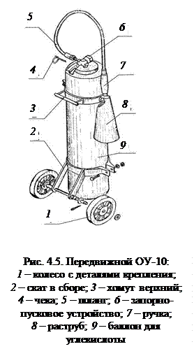 Заполнение ОУ углекислотой производят, подавая ее в отверстие, в которое вставляется трубка 7 (рис. 4.3) при смещении поршня 10 (рис. 4.4) влево рычагом 12. При вытеснении углекислоты из баллона и поступлении ее в раструб происходит ее расширение, сопровождающееся сильным охлаждением К числу недостатков ОУ следует отнести снижение эффективности выброса углекислоты в зону горения при низких температурах. ОУ вместимостью баллонов 10 – 80 л называют передвижными (рис. 4.5). ОУ вместимостью 20 – 30 л комплектуют из ОУ-10, соответственно по 2 – 3 штуки. Они перемещаются на тележке (см. рис. 4.5). ОУ вместимостью 40 л перемещают на горизонтальной трехколесной тележке. ОУ вместимостью 80 л комплектуют из двух огнетушителей по 40 л. Запорные головки передвижных огнетушителей идентичны рассмотренным раньше для переносных огнетушителей. Некоторые ОУ при большой длине бронированного шланга до раструба (например, ОУ-20) оборудуются выпускным клапаном. Его устанавливают перед раструбом и рекомендуют применять при тушении пожаров классов А и В и особенно Е (электроустановок) напряжением до 1000 В. Некоторые общие параметры технических характеристик ОУ приводятся в табл. 4.3.