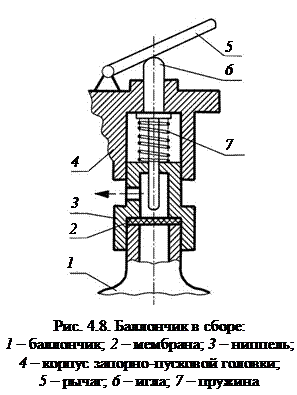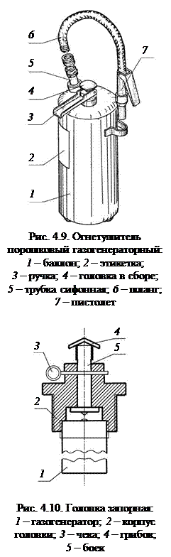 Огнетушители ОП(Г). Они отличаются от огнетушителей ОП наличием газогенерирующего устройства, устанавливаемого внутри корпуса. Они имеют ряд достоинств. Давление в корпусе огнетушителя отсутствует, поэтому они более надежны в работе и безопасны при хранении. Их масса при одинаковой вместимости меньше, чем у ОП с другим способом вытеснения огнетушащего вещества. Важна также простота перезарядки, так как не требуется компрессорное оборудование. Особенностями конструкции ОП(Г) является (рис. 4.9) то, что запорная головка 4 в сборе и трубка сифонная 5 выполнены и установлены раздельно. Поэтому управление выпуском порошка осуществляется только пистолетом 7. Принципиальная схема головки ОП(Г) представлена на рис. 4.10. В корпус головки 2 ввинчивается генератор 1. Некоторые параметры технических характеристик ОП (Г) приведены в табл. 4.6. Таблица 4.6