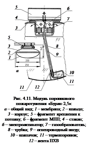 ления модуля к потолку защищаемого помещения. Пространство, ограниченное мембраной и корпусом, предназначено для хранения огнетушащего порошка, газообразователя, электрического активатора и самосра- В стакане 4 установлен спрессованный газообразователь 7, опоясанный огнепроводным шнуром 9, который в изоляционной трубке 8 подводится к колпачку 10, заполненному термопорошком 11. Шнур 9 в верхней части присоединен к электроактиватору 6. При воздействии на мембрану 1 тепла или пламени, уже при нагреве ее до (85±5) оС, самовоспламеняется порошок 11 в колпачке 10. Тепло, распространяясь по горящему шнуру, подводится к газообразователю 7. При его горении выделяется большое количество газов. Этот газ через отверстия в стакане 4 поступает внутрь модуля, повышая в нем давление. При достижении расчетного давления (0,4 – 1,2 МПа для различных модулей) мембрана 1 разрывается по сделанным на ней канавкам, и огнетушащий порошок выбрасывается на очаг горения. Так как мембрана изготовлена из мягкого алюминия, то какие-либо твердые частицы не образуются. Электропуск модуля осуществляется импульсом тока 100 мА продолжительностью не менее 0,1 с при напряжении на контактах модуля не менее 6В. МПП производятся в виде цилиндров с плоскими мембранами на их основании. Все они рекомендуются для тушения пожаров класса А и В и электроустановок под напряжением до 5000 В. Однако большинство из них включаются в работу только от электросети и рекомендуются в основном для комплектования автоматических установок пожаротушения. Некоторые параметры технических характеристик ряда МПП приводятся в табл. 4.7. Таблица 4.7