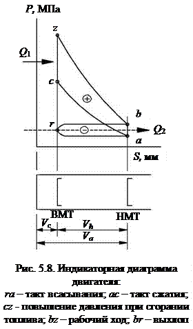 Индикаторная диаграмма – диаграмма изменения давления газа в цилиндре двигателя в зависимости от изменения положения поршня, записанная с помощью прибора индикатора. Пример такой диаграммы для карбюраторного двигателя показан на рис. 5.8. Важными параметрами индикаторной диаграммы являются давление в конце такта сжатия Р с, МПа, и давление в конце сгорания Рz, МПа.