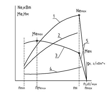 Концентрацию CO выражают в объемных процентах. Концентрацию СН и NOx записывают в миллионных долях, например: r CH = где r CH – концентрация СН в отработавших газах, млн-1; V CН – парциальный объем СН, м3; V см – объем выпускных газов, м3. Очень опасной является сажа. На ней адсорбируется большое количество веществ и она, к сожалению, не улетучивается, а осаждается на пол. Наиболее опасным из них является бенз- Характеристики двигателей – это зависимости основных показателей двигателей (Ne, Me и ge) от частоты вращения его коленчатого вала n, об/мин. Характеристику Ne = f (n) называют скоростной (кривая 1 на рис.5.9). Скоростную характеристику, полученную при полной подаче топлива, называют внешней. Характеристики, получаемые при неполной подаче топлива, называют частичными (кривая 2 на рис 5.9). В характеристиках указывают минимальные обороты двигателя n min; обороты nN, соответствующие максимальной мощности Ne max, и обороты максимального крутящего момента nMe max.