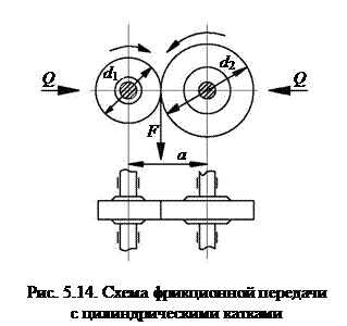 КПД трансмиссии оценивается потерей мощности при передаче ее от двигателя к исполнительному механизму и определяется по формуле h = где Ne – эффективная мощность двигателя; N м – мощность механических потерь в трансмиссии; N и – мощность, подводимая к исполнительному механизму. КПД определяется экспериментальным путем при стендовых испытаниях трансмиссии. Величина η в значительной степени зависит от типа и конструкции трансмиссии, частоты вращения ее элементов, передаваемой величины крутящего момента, а также вязкости и уровня масла в агрегатах трансмиссии. Общий КПД трансмиссии, состоящий из нескольких механизмов, определяется по формуле hобщ = h1h2…h n, (5.16) где h1,h2, h n – соответственно КПД промежуточных элементов, составляющих трансмиссию. Крутящий момент исполнительного механизма Ми связан с эффективным крутящим моментом двигателя Ме для случая равномерного вращения зависимостью М и = Ме u общ hобщ. (5.17) Механические трансмиссии включают в себя механические передачи, муфты, сцепления и другие элементы, обеспечивающие передачу энергии. Механические передачи по принципу работы делятся на передачи трением с непосредственным контактом тел качения (фрикционные) и с гибкой связью (ременные передачи); передачи зацеплением с непосредственным контактом (зубчатые и червячные) и с гибкой связью (цепные). Во фрикционных передачах движение передается с помощью сил трения скольжения. Схема простейшей фрикционной передачи с постоянным передаточным отношением показана на рис. 5.14. Полезное окружное усилие F определяется по формуле b F = Qf, (5.18) где b – коэффициент запаса сцепления, учитывающий упругое скольжение; Q – усилие прижатия трущихся поверхностей муфт; f – коэффициент трения.