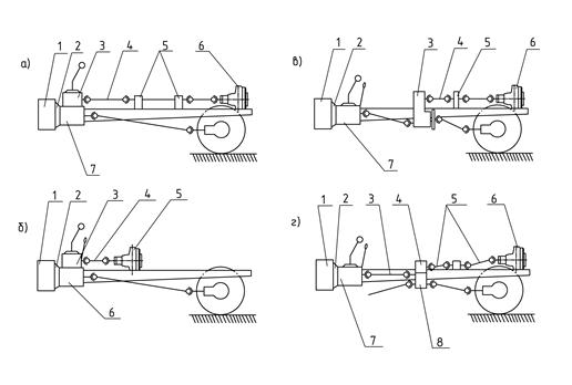 Рис. 5.17. Схемы компоновки дополнительных трансмиссий: 1 – двигатель; 2 – сцепление; 3 – коробка отбора мощности; 4 – карданный вал;