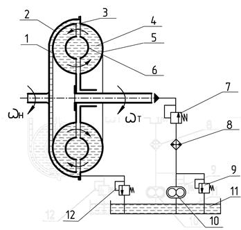 Рис. 5.18. Гидромуфта: 1 – турбинное колесо; 2 – крышка; 3 – насосное колесо; 4 – лопасти; 5 – наружный тор; 6 – внутренний тор; 7 – клапан заполнения; 8 – радиатор; 9 – предохранительный клапан; 10 – насос питания; 11 – бак; 12 – клапан опорожнения