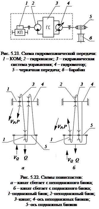 Основными элементами полиспастов являются системы подвижных и неподвижных блоков и канаты (рис. 5.22, а, б). Все блоки вращаются на осях 4 и 5. Блоки, установленные на неподвижной оси 4, называются неподвижными, а перемещающиеся по оси 5 – подвижными. Полиспасты выполняются по различным схемам: в одних – канат сбегает с неподвижного блока (рис. 5.22, а), в других (рис. 5.22, б) – с подвижного. У полиспастов со сбегающим с неподвижного блока канатом усилие на нем, Н, определяется по формуле Р = где Q – сила тяжести груза, Н; q – сила тяжести подвижной обоймы полиспаста, Н; n – число блоков в системе; h – коэффициент полезного действия блока. Значение КПД для блоков на подшипниках качения принимают равными h = 0,97 – 0,98, а для блоков на подшипниках скольжения h = 0,94 – 0,86. Число блоков n в системе характеризует его кратность. Скорость перемещения сбегающего каната с неподвижного блока системы (рис. 5.22, а) равна Vр = VQn. (5.23) Для случая, когда канат сбегает с подвижного блока справедливы зависимости: Р =