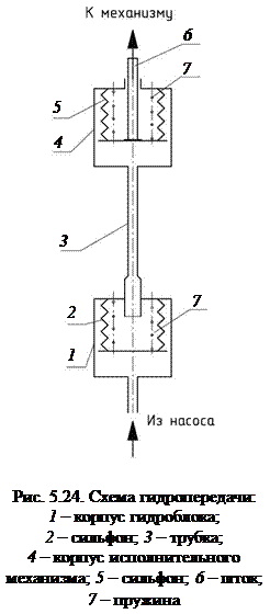 Соотношение между усилием на рукоятке рычага и усилием включения рабочего органа исполнительного механизма системы с механическим приводом характеризуется передаточным числом u = S/h. Обычно u = 25 – 40. Такие приводы используются для включения КОМ, газоструйных вакуумных аппаратов, приводов вакуумных насосов ПЦН и т.д. Принципиальная схема гидравлического привода представлена на рис. 5.24. В гидрокамере 1 запаян сильфон 2. В разгруженном состоянии он удерживается пружиной 7. Трубка из этого сильфона соединена с корпусом 4 механизма включения, в котором размещен сильфон 5 со штоком 6. Сильфон 5 удерживается в растянутом состоянии пружиной 7. При подаче воды пожарным насосом она поступает в гидрокамеру, заполняя пространство между корпусом 1 и сильфоном 2, деформируя его. Внутренняя полость сильфона трубки 3 и пространства между корпусом исполнительного механизма 4 и сильфоном 5 заполнено гидравлической жидкостью (например, тормозной). Давлением этой жидкости деформиру-