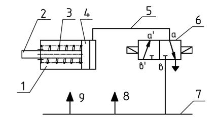 Принципиальная схема привода показана на рис. 5.25. Пружиной 3 поршень 4 со штоком 2 отжаты вправо. Управляемый механизм выключен. При включении электромагнитного клапана 6 точки а' и b' займут место точек а и b. При этом сжатый воздух по пневмоприводу 7 поступит в надпоршневое пространство. Давление воздуха на поршень 4 сожмет пружину 3 и штоком 2 будет включен управляемый механизм.
