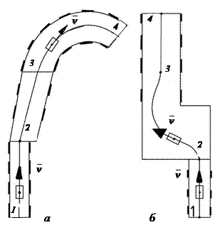 называют коэффициентом устойчивости автомобиля против опрокидывания. Для определения К автомобиль устанавливают на наклонную платформу (см. рис. 6.10, б), замеряют угол b, при котором произошла разгрузка колес одной стороны автомобиля, и затем по формуле (6.63) определяют численное значение K. Неравенства (6.58) и (6.59) составлены без учета деформации шин, подвески и кузова АТС, поэтому значения К, вычисленные по экспериментальному значению b, на 10 – 15 % меньше, чем определенные по формуле (6.64). При определении коэффициента К пожарных автоцистерн необходимо учитывать также уменьшение К из-за смещения центра масс жидкости относительно цистерны при частичном ее заполнении. Если масса жидкости составляет не более 30 % от общей массы ПА, то уменьшение коэффициента К не превышает 5 – 7 % и определить его экспериментально сложно. Поэтому для оценки эффективности мероприятий по обеспечению безопасности движения пожарных автоцистерн необходимо использовать другие виды испытаний на устойчивость управления АТС. Такими видами испытаний являются «поворот» и «переставка» (рис. 6.12). При испытании «поворот» водитель ПА постепенно, от заезда к заезду, увеличивает скорость движения по прямой 1 – 2 (рис.6.12, а). На участке 2 – 3 водитель должен, не снижая скорости, пройти дугу поворота радиусом R = 30 – 60 м. При испытании фиксируется скорость, при которой на участке 2 – 3 происходит или отрыв колес одной стороны ПА от дороги, или занос, или выход ПА из коридора безопасности (под коридором безопасности понимается ширина разметки проезжей части дороги на повороте