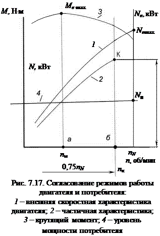 Потребителями энергии могут быть генераторы электрического тока, лебедки, компрессоры, приводы механизмов пожарных автолестниц и автоколенчатых подъемников, а также пожарные насосы на автоцистернах и автонасосах. Мощность потребителей энергии на пожарных машинах сравнительно небольшая, да и эксплуатируются они в основном (кроме пожарных насосов) при постоянных скоростных режимах. Поэтому согласование режимов их эксплуатации и двигателя в основном осуществляется по скоростным параметрам. Рассмотрим это на следующем примере (рис. 7.17). На этом рисунке кривая 2 является частичной скоростной характеристикой, ограничивающей мощность двигателя при его работе в стационарном режиме. Кривая 3 характеризует крутящий момент, соответствующий частичной скоростной характеристике (кривая 2). Прямая 4 характеризует максимальную мощность потребителя. Диапазон скоростных его режимов от n м до n к может быть рекомендован для привода потребителя. Зная обороты вала потребителя n п и выбранные обороты двигателя n дв, определяют передаточное отношение привода:
