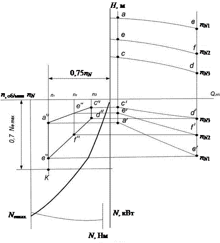 Рис. 7.18. Согласование режимов работы двигателя и пожарного насоса Используя передаточное отношение, легко находим частоты вращения вала двигателя, соответствующие скоростям вала насоса n 1 = i n н1,