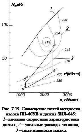 Вычисленные значения Нх и Nх при различных скоростях nN изображают, как показано на рис. 7.18. Поле а'b'dc' характеризует потребляемую насосом мощность. Для сопоставления отбираемой от двигателя мощности и мощности, потребляемой насосом, необходимо согласовать частоты вращения вала двигателя n дв с частотами вращения n н вала насоса. Это согласование осуществляется передаточным отношением коробки отбора мощности по формуле