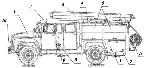 Рис. 8.14. Автомобиль пожарный АНР-40(130)127: 1 – шасси; 2 – кабина боевого расчета; 3 – всасывающие рукава; 4 – кузов; 5 –отсеки ПТВ; 6 – рукавная катушка; 7 – запасное колесо; 8 – опорный патрубок; 9 – патрубок для подачи пенообразователя; 10 – всасывающий патрубок