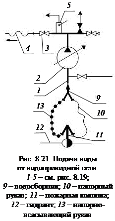 создав насосом заданный напор, открыть задвижку 3 на напорном трубопроводе; поддерживать требуемый напор изменением частоты вращения вала двигателя. При заборе воды из цистерны на АЦ с насосами ПЦНН и ПЦНВ перед пуском насосов следует закрыть вакуумный кран, а вакуумный насос вручную отключить от пожарного насоса. При этом рукоятка дозатора должна находиться в положении «Закрыто». Подача воды пожарным насосом из открытого водоема. Работа по подаче воды пожарными автоцистернами и насосно-рукавными автомобилями из открытых водоисточников производится в ряде случаев. Это имеет место в населенных пунктах со слабо развитой сетью водоснабжения, в сельской местности, а также в случаях, когда для тушения пожара требуется большое количество воды. Например, при тушении горящей нефти и нефтепродуктов в резервуарах или пожаров газовых и нефтяных фонтанов воду обычно подают из открытых естественных или искусственных водоемов. Подготовка к подаче воды производится в следующей последовательности (рис. 8.20): извлекают из пеналов всасывающие рукава, соединяют их друг с другом и подсоединяют всасывающую сетку; снимают заглушку со всасывающего патрубка 1 и подсоединяют к нему всасывающие рукава 9 с сеткой;