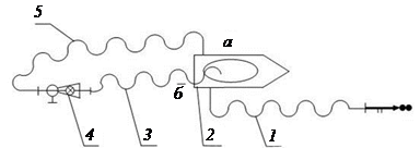 Рис. 8.23. Схема подачи воды гидроэлеватором: 1 – рукавная линия; 2 – цистерна; 3 – напорный рукав 77 мм; 4 – гидроэлеватор;
