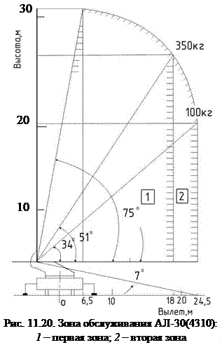 Статический коэффициент грузовой устойчивости определяется таким же образом, но без учета дополнительных нагрузок, указанных выше. Его величина должна быть К с = 1,15. Коэффициент поперечной статической устойчивости должен находится в пределах, установленных для базовых шасси. При достигнутом уровне совершенства и надежности конструкции АЛ их безопасность в работе осуществляется в установленной определенной зоне обслуживания (поле движения). В этой зоне автоматически выключаются все элементы лестницы при достижении границ ее безопасной работы. Кроме того, предусмотрено автоматическое боковое выравнивание выдвигаемой лестницы, а также ограничение нагрузки на лестницу, люльку и ее поддержание в горизонтальном состоянии. Зона обслуживания. Для каждой автолестницы определено поле движения (или зона обслуживания) – зона, находясь в которой вершина лестницы может быть нагружена полностью (рис. 11.20). Устойчивость АЛ при работе зависит от опрокидывающего момента, действующего на лестницу. Его величина не может превышать расчетного значения. Поэтому вылет лестницы не может быть больше установленного и ограничивается при работе автоматикой. Вылет – это расстояние от оси поворотного основания до проекции вершины лестницы на горизонтальную плоскость. Для современных АЛ в зоне обслуживания определены две зоны с различными значениями вылетов и допустимого нагружения вершины лестницы. Например, для АЛ-30(4310) 1 и 2 зоны обслуживания характеризуются вылетами 18 и 24 м при максимальных нагрузках на вершину лестницы, равных массе 350 и 100 кг, соответственно. В зоне обслуживания граничные условия работы обеспечиваются специальным прибором блокировки. Привод прибора блокировки обеспечивает передачу движения от комплекта колен к прибору блокировки (рис. 11.21).