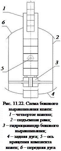 Угол подъема подъемной рамы 2 передается на прибор блокировки 12 рычагом 10 с тягой 5. Рычаг 10 и штырь на подъемной раме 2 идентичны, следовательно, на приборе блокировки повторяется угол подъема или опускания колен. При достижении предельного значения угла подъема произойдет автоматическое выключение механизма подъема. Блокировка выдвигания и сдвигания колен лестницы осуществляется с помощью цепной передачи. Она включает набор звездочек и цепей, расположенных так, как показано на рис. 11.21. Цепи опоясывают звездочки. На цепи закреплен кронштейн 3, прикрепленный к штоку гидроцилиндра выдвигания (гироцилиндр выдвигания установлен в подъемной раме). При перемещении кронштейна 3 движение цепями 13, 7 и 9 будет передаваться на звездочку 11, а затем на прибор блокировки. При достижении предель- Прибор блокировки обеспечивает автоматическое отключение: механизма подъема лестницы при достижении максимального угла 73о; механизма выключения и опускания при достижении вершиной лестницы вылета 24 м (то же при вылете 18 м); переключение системы бокового выравнивания на автоматическую работу при угле наклона более 10о.