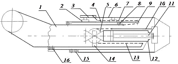 Рис. 11.27. Схема выдвигания телескопических секций: 1 – первая секция; 2, 14 – скользун; 3 – натяжник; 4 – вторая секция; 5, 9 – ролики;