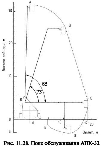 Примечание. На АПК устанавливают лафетные стволы с подачей 20 л/с. Обеспечение боевой готовности и надежность АПК. Для эффективного использования АПК или АЛ предусматривается техническое обслуживание и техническое освидетельствование. Техническое обслуживание включает все виды проводимых обслуживаний, как и для АЛ. Перечень работ регламентируется заводскими инструкциями. Техническое освидетельствование АПК. Техническое освидетельствование проводится в целях обеспечения надежной работы всех механизмов АПК. Проверка работы всех устройств автоматики. Блокировку и сигнализацию проводят по всей границе поля движения люльки, называемого зоной обслуживания. Зона обслуживания устанавливается заводом-производителем. Она включает область безопасной работы полностью нагруженной люльки и охватывает высоту подъема и вылет стрелы (рис. 11.28).