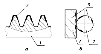 Рис. 15.4. Коррозия рабочих поверхностей деталей а – рейка топливного насоса: 1 – рейка; 2 – коррозия;