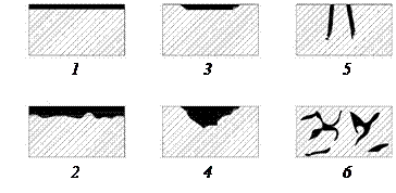 На незащищенной от влияния внешней среды металлической поверхности образуется бесчисленное множество таких микроэлементов. Часто такой вид коррозии реализуется в атмосфере воздуха, поэтому такая коррозия называется атмосферной. В реальных условиях металлы неоднородны. На поверхности металлических изделий находятся кристаллические зерна различной ориентации, состав металла которых может быть различным вследствие микроликвации, сам сплав может иметь неоднородное строение. Из-за этой неизбежной неоднородности разные участки поверхности деталей характеризуются различными потенциалами. Участки с более отрицательным электродным потенциалом играют роль анодов. Они и будут разрушаться. Механические напряжения также увеличивают отрицательные потенциалы, они усиливают электрохимическую коррозию. Неоднородность металла деталей, разные напряжения в различных их частях, неодинаковая интенсивность коррозионных процессов являются причиной образования различных форм коррозионных поражений (рис. 15.6).