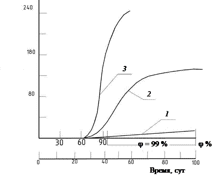 Рис. 15.7. Влияние загрязнений атмосферы на коррозию стали: 1 – чистая влага; 2 – влага и 0,05 % SО2; 3 – то же, образцы покрыты пылью из SiО2