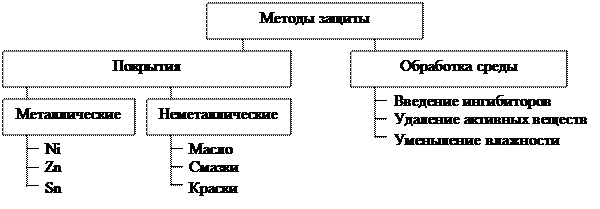 На производстве стремятся подбирать металлы так, чтобы εа - εк ® 0. В эксплуатации создают условия изоляции изделий от влияния внешней среды или увеличивают дополнительное сопротивление R доп. В общем виде методы защиты металлических поверхностей и изделий из них можно представить, как показано на рис. 15.8.