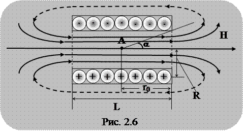 Рассчитаем напряженность магнитного поля внутри соленоида, длина которого L, радиус витка R, число витков N, сила тока I. Будем считать, что в любой точке соленоида вектор H направлен параллельно оси. Для расчета напряженности воспользуемся законом полного тока в виде
