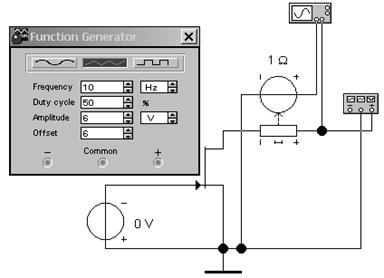График выходной характеристики можно получить на экране осциллографа, если на горизонтально отклоняющие пластины подать «качающееся» напряжение сток-исток, а на вертикально отклоняющие пластины – напряжение, пропорциональное току стока. Схема и установки на панели осциллографа показаны на рис. 4. Напряжение сток–исток Uси с выхода функционального генератора подается на вход канала В осциллографа, а для регистрации величины тока стока Iс в его цепь включен преобразователь тока в напряжение (Current Controlled Voltage Source), которое затем подается на вход А осциллографа. Для получения на экране осциллографа графика ВАХ используется режим развертки А/В.