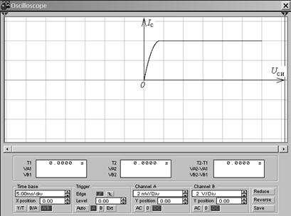Рис. 5. График выходной характеристики на экране осциллографа На рис. 5 показан график выходной характеристики при Uзи = 0. Масштаб по оси напряжения Uси составляет 2 Вольта на деление (канал В), по оси тока Iс – 2 мА на деление (канал А). Начало координат находится в центре экрана. Контрольные вопросы 1. На каком принципе основано управление током в полевом транзисторе? 2. Что представляет собой канал полевого транзистора? От чего зависит толщина канала? 3. Каким образом изолируется канал от подложки? Из каких соображений устанавливается полярность напряжения на стоке? 4. Каким образом обеспечивается изоляция затвора от канала в различных типа полевых транзисторов? Из каких соображений устанавливается полярность напряжения на затворе? 5. Что называется напряжением отсечки и напряжением насыщения? 6. Чем отличается полевой транзистор от биполярного как управляемый источник тока? 7. Какие дифференциальные параметры характеризуют полевой транзистор в режиме малого сигнала? Напишите уравнение для приращения тока стока. 8. Какие соотношения между электрическими величинами (сигналами) отражает малосигнальная эквивалентная схема транзистора? 9. Как зависит от напряжения затвор-исток крутизна передаточной характеристики в области насыщения выходных характеристик? 10. Как можно оценить величину входного сопротивления усилителя на полевом транзисторе? Содержание отчета Отчет о лабораторной работе должен содержать: 1) титульный лист; 2) цель исследований; 3) схему установки для проведения измерений; 4) таблицы результатов измерений передаточных и выходных характеристик и крутизны передаточной характеристики; 5) графики вольт-амперных характеристик; 6) значения основных параметров транзистора. Литература 1. Опадчий Ю.Ф. и др. Аналоговая и цифровая электроника (Полный курс): Учебник для вузов / Ю.Ф. Опадчий, О.П. Глудкин, А.И. Гуров; Под ред. О.П. Глудкина. – М.: Горячая Линия – Телеком, 2002. – 768 с. 2. Гусев В.Г., Гусев Ю.М. Электроника: Учеб. пособие. – 2-е изд. – М.: Высш. шк., 1991. – 622 с. 3. Лачин В.И., Савелов Н.С. Электроника: Учебн. пособие. – Ростов н / Д: изд-во “Феникс”, 1998. – 448 с. 4. Горбачев Г.Н., Чаплыгин Е.Е. Промышленная электроника: Учебник для вузов / Под ред. В.А. Лабунцова. – М.: Энергоатомиздат, 1988. – 320 с. 5. Схемотехническое моделирование аналоговых и цифровых электронных схем: Методические указания по применению программы Electronics Workbench 5.0 при выполнении лабораторных работ по курсам электротехники, электроники и схемотехники ЭВМ / Курск. гос. техн. ун-т; Сост. В.И. Иванов. Курск, 2003. – 59 с.