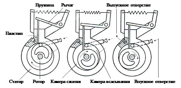 Рис.2. Схема конструкции пластинчато-статорного форвакуумного насоса. Недостатком пластинчато-статорных и плунжерных (поршневых) насосов являются повышенные вибрации и шум. Поэтому в настоящее время вакуумные системы микроскопов и других вакуумных установок комплектуются пластинчато-роторными насосами, создающими при работе минимальные вибрации. Выпускаемые промышленностью пластинчато-роторные насосы имеют быстроту действия до 6 л/с и обеспечивают форвакуум до 1 Па.