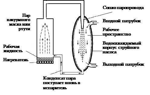 1.2.2. Струйные высоковакуумные насосы. Принципиальная схема струйного насоса приведена на рис.3. Источником пара является рабочая жидкость (вакуумное масло или ртуть), нагретая нагревателем до температуры кипения. Образующийся при кипении рабочей жидкости пар поступает с большой скоростью через сопло в рабочее пространство, в котором создан форвакуум ~102 Па. Поступающий в рабочее пространство через впускной патрубок газ диффундирует в струю пара. В этих условиях молекулы откачиваемого газа в результате столкновения с молекулами пара получают составляющую скорости в направлении движения струи, что и обуславливает разность давлений между впускным и выпускным патрубками.