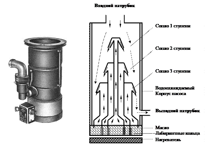 Рис.4. Внешний вид и схема конструкции высоковакуумного диффузионного насоса. По паропроводам пар поступает к трем зонтичным соплам 1, 2 и 3 ступени. Струи пара сообщают импульс молекулам воздуха в направлении выходного патрубка, в результате давление газа в верхней части насоса (входной патрубок) понижается, происходит откачка газа.