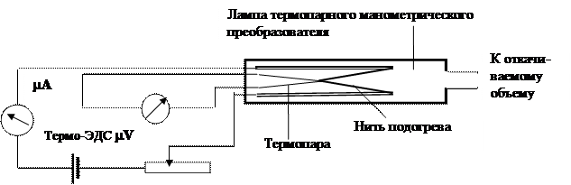 2.3. Термопарный вакуумметр. Манометрический преобразователь представляет собой стеклянную или металлическую лампу (рис.8), в которой на специальных вводах смонтированы платиновый или никелевый подогреватель и приваренная к нему термопара (хромель – копель или хромель – алюмель). Измерение давления производят при постоянном токе J через подогреватель.