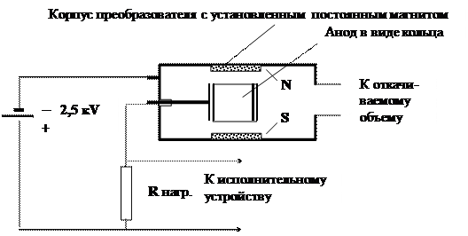 2.5. Магнитный электроразрядный датчик вакуума. Магнитный электроразрядный преобразователь не содержит в конституции нагреваемых деталей и может включаться при любом давлении в вакуумной системе. Ионизация газа в таком вакуумметре осуществляется благодаря самостоятельному разряду между холодными катодом и анодом. Катодом является корпус преобразователя, рис.10. Анод выполнен в виде металлического кольца. Вдоль оси анода создают магнитное поле с индукцией 0,05 – 0,2 Тл. Через сопротивление нагрузки на анод подают высокое (2,5 - 3 кВ) напряжение. При ухудшении вакуума (давлении ~102 Па, величина которого устанавливается при настройке датчика) между анодом и катодом возникает самостоятельный тлеющий разряд, напряжение на сопротивлении нагрузки (R нагр) резко возрастает, срабатывает защитное устройство. В силу простоты эксплуатации и большой устойчивости в работе магнитные электроразрядные датчики вакуума широко применяются для управления работой сложных устройств, включающих вакуумную систему.