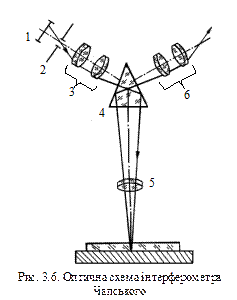 Використовуваний у даній роботі інтерферометр Чапського (рис. 3.6) складається із широкого джерела світла 1 (неонової лампи зі світним диском), щілинної діафрагми 2 змінні величини, конденсора 3, разподілювальної призми 4 з кутами 60о, об'єктива 5, окуляра 6. Промінь світла, пройшовши конденсор, відбивається призмою і, пройшовши через об'єктив, падає на випробувану пластинку, відбивається від двох поверхонь, знову проходить об'єктив, призму і потрапляє в окуляр. Інтерференційна картина локалізується у фокальній площині об'єктива 5. Спостерігають інтерференційну картину за допомогою окуляра 6. Прилад застосовують для контролю пластин з величиною клина не більше 12² при товщині пластини 10[мм].