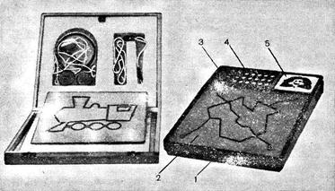 На амбліотренері проводять наступні види вправ амблиопічного ока, засновані на поєднанні: зорових подразнень з дотиковими (використовується тактильна чутливість) і звукових; зорових зі звуковими подразненнями; кінестетичних із звуковими. Різноманітність тестів сприяє успішному проведенню вправ. Амбліотренер АТР-1 - настільний прилад, що складається з корпусу 1 (див. рис. 5.1) прямокутної форми, на верхній площині якого є панель 2 з органічного скла молочного кольору, панель 3 і грати 5 з малюнком «голова левеняти». Панель 2 розташована під невеликим нахилом і втоплена по відношенню до всієї площини. У поглибленні поміщаються змінні грати, плати і малюнки з оптотипами. Під панеллю розміщено сімнадцять ламп. На панелі 2 встановлено сімнадцять контактних виводів 4, ручка головного регулювання яскравості ламп, кнопка перемикання режимів роботи і кнопка перемикання ігрового елементу. Положення ручки регулювання яскравості контролюється за шкалою. У приладі застосований ігровий елемент у вигляді малюнка «голова левеняти» 5, очі якого можуть засвічуватися, і одночасно лунає звуковий сигнал у разі неправильного виконання дитиною завдання. Ігровий елемент полегшує контакт медичного персоналу з дитиною, зацікавлює його і сприяє успішному лікуванню. На бічній панелі розташовані розетки: для підключення трансформатора і телефону, а також розетка для підключення стрижня-покажчика. Головний телефон має регулятор гучності. У стрижень вмонтована контактна пружина, при натисненні якої спалахують очі левеняти. До приладу додаються троє грат з отворами діаметром 1,5; 5 і 10 мм; червоний фільтр, що дозволяє мати світлові тести червоного кольору; плата із струмопровідними тестами діаметром 2 мм з одного боку і 4 мм - з іншого; дві плати з двосторонніми малюнками для обведення; малюнки з оптотипами для визначення гостроти зору за принципом порівняння у дітей молодшого віку. При установці на панель 2 приладу грат і торканні стрижнем контактних виводів 4 засвічуються відповідні отвори. Якщо необхідні отвори червоного кольору, то на панель укладають світлофільтр, а зверху - грати з необхідними діаметрами отворів. При установці на панель 2 плати із струмопровідними круглими тестами і торканні стрижнем тестів в навушниках головного телефону лунає звуковий сигнал і спалахують очі левеняти на гратах 5 (кнопка знаходиться в натиснутому положенні). У випадках сходу указки з круглих тестів або контура малюнка на полі плати звуковий сигнал в навушниках головного телефону пропадає і світло в очах левеняти зникає. У приладі передбачений режим, при якому звуковий сигнал звучить і очі левеняти горять у разі торкання указкою поля плат, тобто режим, зворотний вищеописаному, для чого необхідно натиснути на кнопку на панелі 3. Якщо світло в очах левеняти заважає проведенню лікування, то його можна вимкнути. При установці на панель 1 малюнків з оптотипами і використанням стандартних настінних таблиць з оптотипами визначають гостроту зору у дітей дошкільного віку. При підготовці до роботи слід підключити штепселі дроту до розетки і трансформатора. Включити штепсельну вилку трансформатора в мережу. Вставити штепсель телефону в гніздо на бічній панелі. Вставити штепсель стрижня в гніздо. Встановити ручку яскравості в крайнє праве положення, що відповідає макси